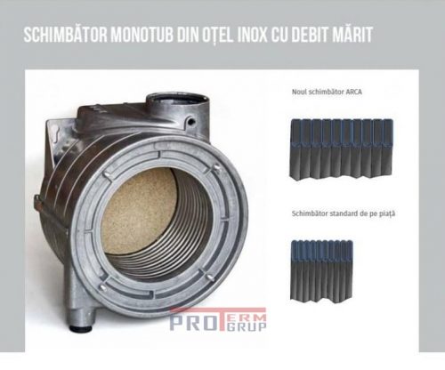 Cazanul utilizeaza un schimbător din oțel inox monotub pentru a oferi utilizatorului maximum confort și economisire energetica.